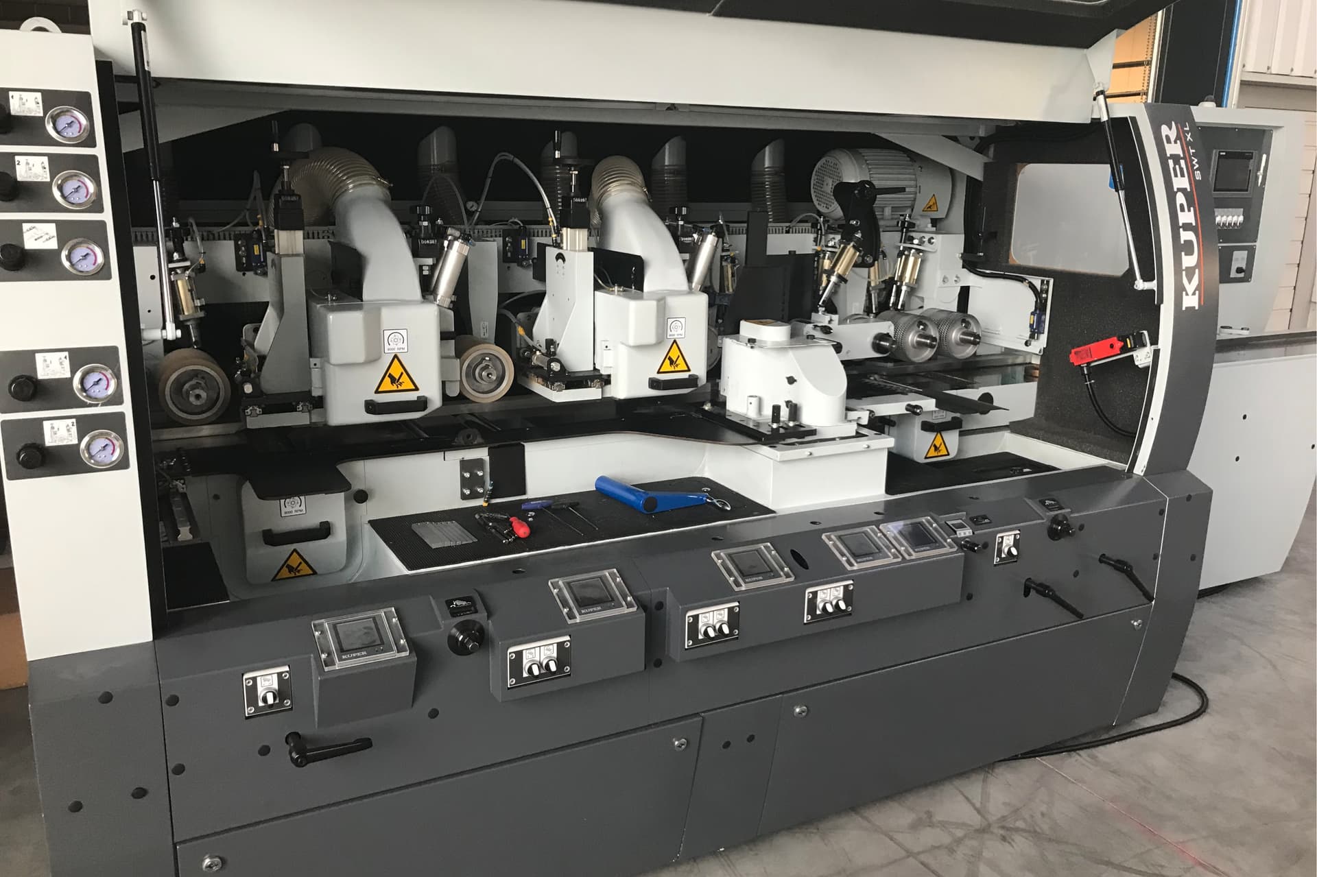 Vierseitenhobelmaschine Kuper SWT XL-6 in Fenster-Versionmit elektronischer Axial- und Radialverstellung der Spindeln.