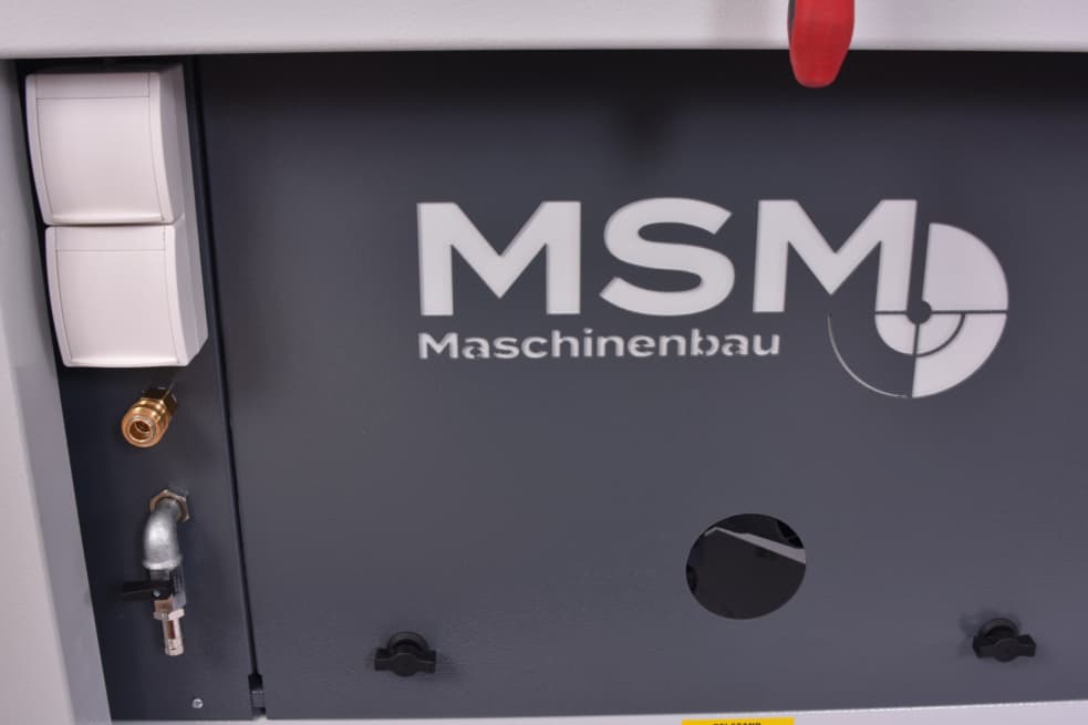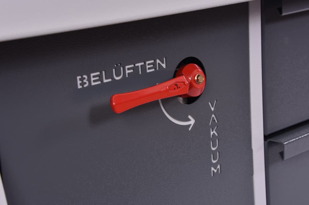In der Maschinenfront sind neben einem zusätzlichen VAKUUMANSCHLUSS noch zwei STECKDOSEN und eine DRUCKLUFTANSCHLUSS untergebracht. Somit steht dem Anwender direkt vor der Vakuumpresse alles zur Verfügung, was er braucht, um Materialien vorzubereiten, Werkstücke zu bearbeiten und für ein perfektes Finish zu sorgen.