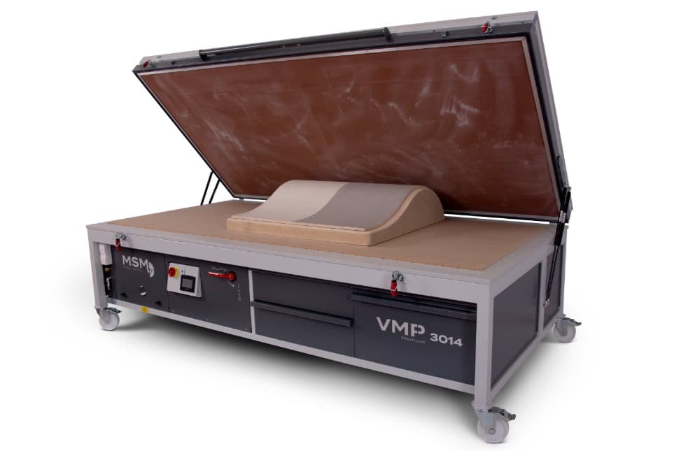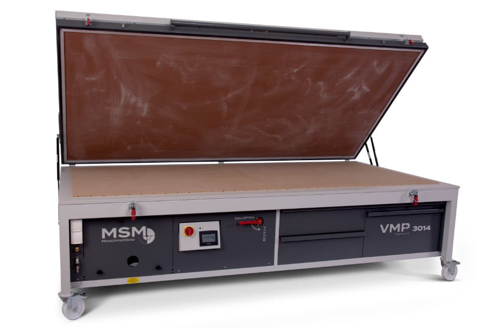 Mit drei geräumigen SCHUBKÄSTEN wird erstmals bei einer Vakuumpresse auch der Platz unter der Arbeitsplatte optimal genutzt. Hier finden Leim, Beilagen, Zwingen, Klebeband und weitere Utensilien ihren Platz und sind immer sofort verfügbar.