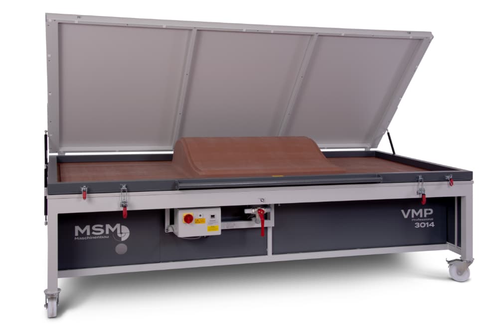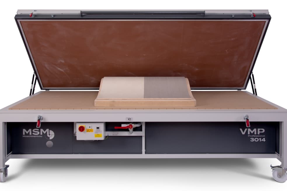Die VMP Professional verbindet langjährig bewährte Technik mit einer modernen, zeitgemäßen Optik.Durch die Standardlängen von 2000 bis 5500 mm und die Standardtiefen von 1420, 1580 und 1820 mm ist sie DIE VAKUUMPRESSE schlechthin für alle Schreiner und Tischler, die neben Formverleimung auch noch sämtliche Furnierarbeiten und Belegungen mit Schichtstoff und weiteren Materialien durchführen wollen.