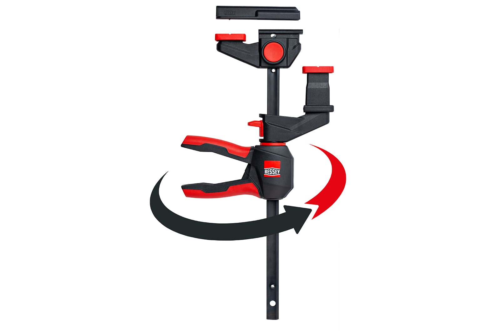 The one-handed clamp series with a handle unit that can be rotated around the rail continues to grow. BESSEY now also offers a one-handed table clamp with a unique 360° rotation mechanism. The EZR360 is not only particularly comfortable to use with just one hand, but also offers numerous areas of application, just like its predecessor, the EZR.
