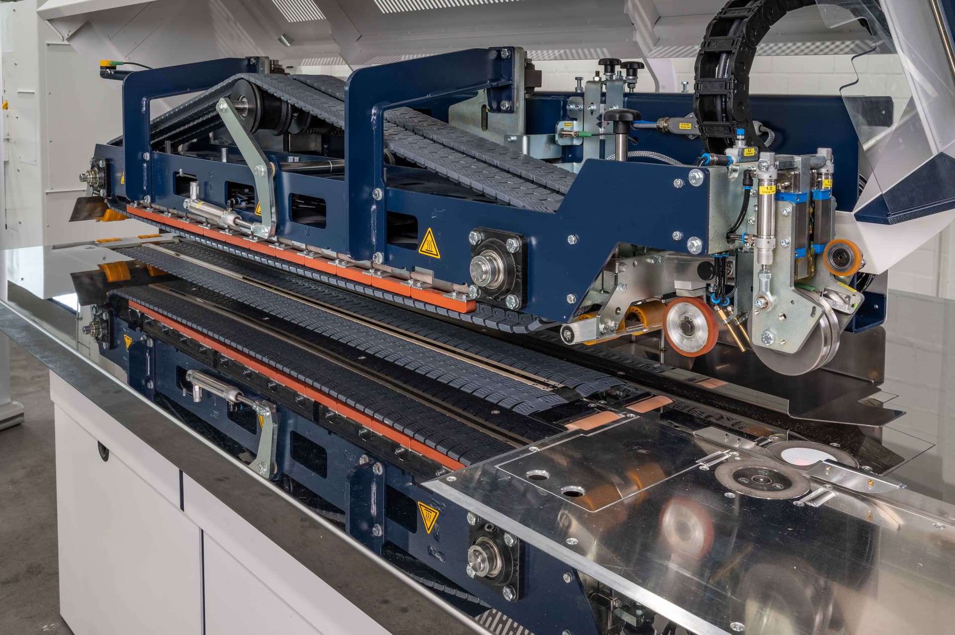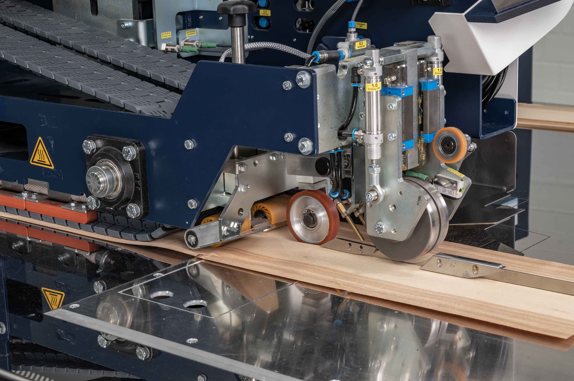 - - Maintenance-free high efficiency plastic chains prevent heat conduction and stains - Heating system with high efficiency and an effective heating width of only 12 mm - Intelligent energy management system with increased capacity and improved standby mode - Innovative veneer infeed device with disc gear and tolerance compensation mechanism for an offset-free infeed
